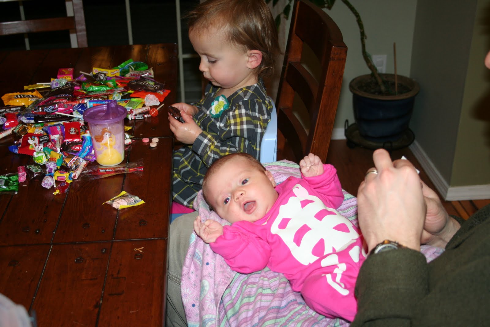 I think the post trick-or-treating candy sort is one of the finest Halloween traditions. Kohen followed in the footsteps of his Daddy by not gorging himself and carefully sorting all the different types of treats. He'd pick his favorites, eat a few, admire a few. He was most happy about this long stick of licorice and most disapointed that no one gave him juice this year. (Last year he got a bottle of sunny-D). Evelyn promptly fell asleep and nearly missed the whole ritual. She woke up when we tried to peal off her costume and then amazed us with her ability to stuff as much candy down her pie hole as she could while unwrapping even more candy faster than we could take it away. I don't think she had a particular favorite...I'm not sure she took the time to taste anything, but she did seem to like the box of dots. Oh and the sweet tarts in the shapes of bones and skulls, Go figure. I was disspointed in the haul simply because there seemed to be a butterfinger famine going on.